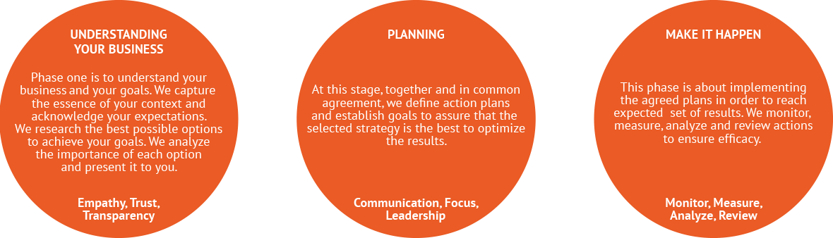 We work synergistically with owners and partners to maximize the profitability of your business, strengthen your brand in the industry and build a relationship of respect and trust that has a long-term value. In an accessible manner, through critical thinking and focused actions, we follow a process that allows us to assess where your company is and how you need to move on to achieve your goals. Lastly, we offer answers targeted to meet your needs.